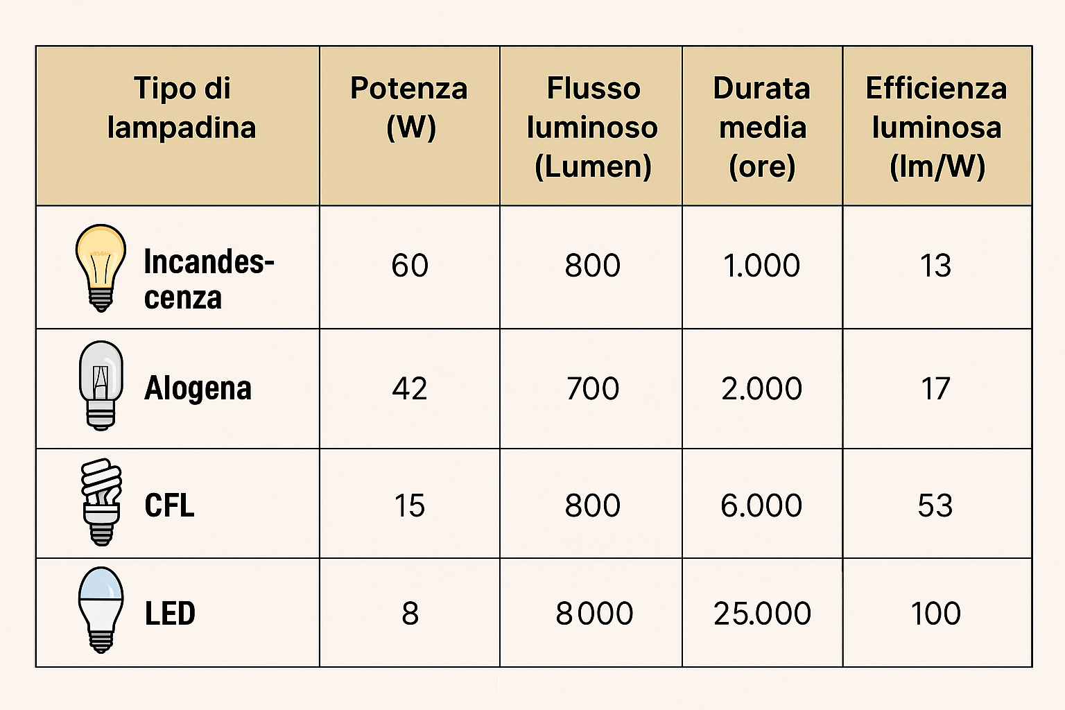 Nota storica: le lampadine a incandescenza sono ormai fuori produzione e vengono citate solo per fare un confronto con le tecnologie moderne in termini di consumi e durata.